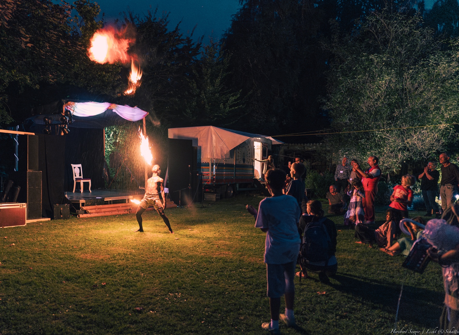 Die Abende gehörten den Live‑Shows: Feuer‑ und Lichtkunst, Jonglage, Tanz und Gesang verwandelten den Hof in eine Manege. Im „Spiegel Saal“ entführte der Whirlingdance‑Workshop in die Welt der Derwische, und auf der Außenbühne heizten DJ Toddy „THK“ und Sascha mit Musik bis spät in die Nacht ein. Dazwischen blieb Zeit für Gespräche und Begegnungen, genau so, wie es sich viele Besucher wünschen: weg vom Alltag, hinein in ein Wochenende voller Inspiration und Freiheit. Dass der Eintritt frei war und alle Angebote auf freiwilliger Spendenbasis stattfanden, unterstrich den gemeinnützigen Charakter des Vereins